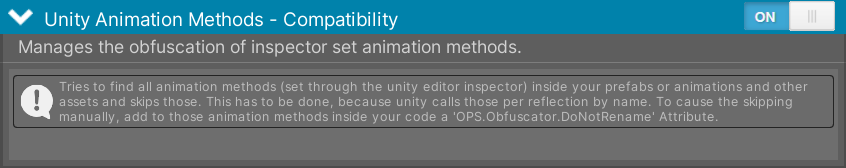 Animations can trigger events, which are methods stored as plain text within the animations and invoked at runtime using Reflection. To prevent obfuscation from breaking these events, this compatibility component scans various assets and prefabs. It searches through model files (including .fbx, .dae, .3ds, .dxf, .obj, and .skp formats), animation files (.anim), and animation controllers (.controller) to identify and exclude these methods from obfuscation.