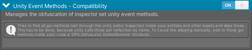 Similar to animation events, UnityEvents assigned through the Unity Inspector (often used for GUI methods) rely on Reflection to invoke their target methods at runtime. To prevent obfuscation from breaking these events, this compatibility component searches through the scenes and prefabs to identify and exclude the associated methods from obfuscation, ensuring that they continue to function as intended.