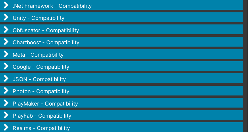 The majority of compatibility components are always-on to maintain seamless compatibility with Unity and the vast majority of commonly used third-party assets.