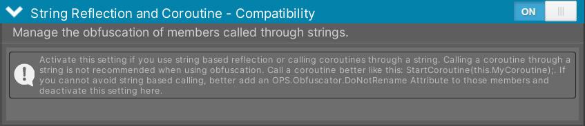 To prevent this issue, the compatibility component ensures that methods, fields, and classes are excluded from obfuscation when they are accessed via reflection. By doing so, the original names of these elements are preserved, allowing Unity to locate and execute them correctly, even after obfuscation.